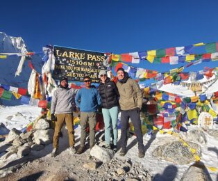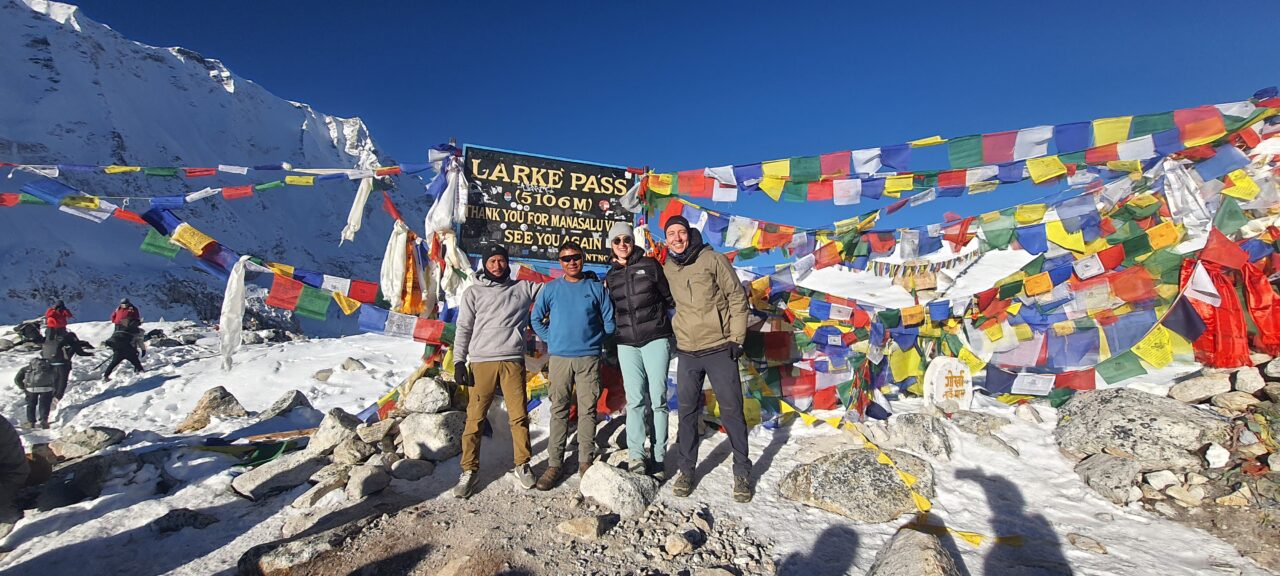 Our group at Larkya La Pass on the Manaslu Circuit Trek from Pokhara.