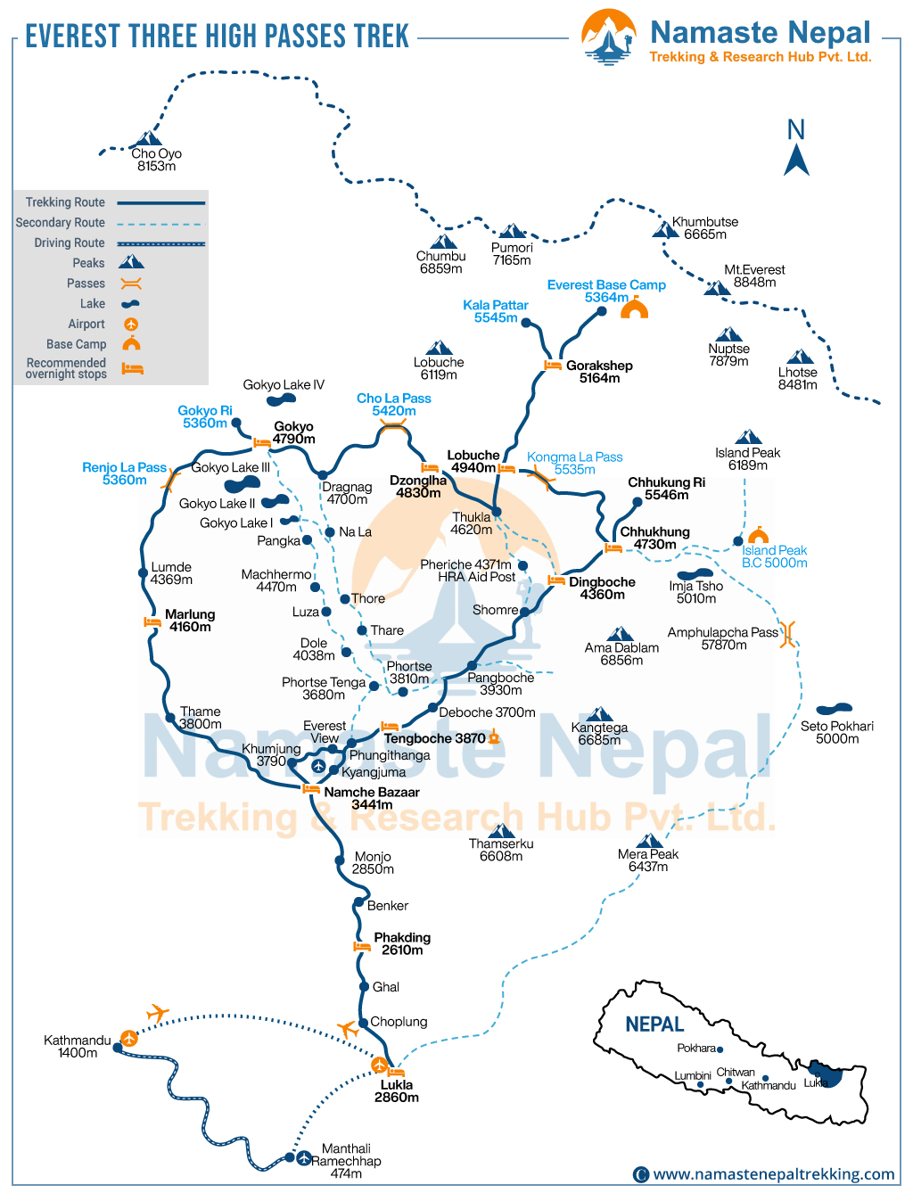 The final major pass is Renjo La Pass at 5,360 meters, which leads you back to Namche Bazaar through Marlung, and eventually loops back to Lukla.