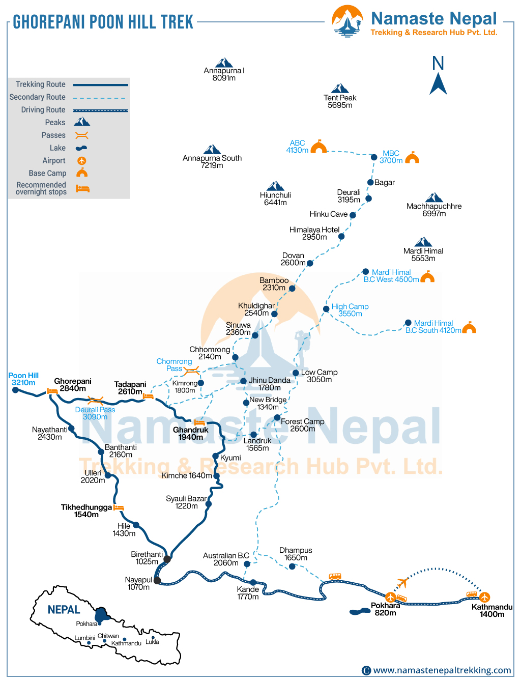 In the case of any emergency, your guide will let us know immediately. Namaste Nepal Trekking & Research Hub will be there to assist you with your Rescue if needed. In a few places in this trek, like Ghorepani or Ghandruk. There are health posts that have been served by doctors and local professionals. We will help you to get there to get treatment and get back to the capital. The NNTR trekking team is ready to ensure your safety anytime during the trek, even to carry you down to a safer place.